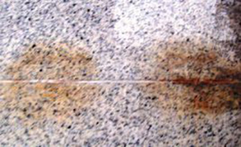 1、石材原材含鐵量較高(如美國白麻,黃砂巖等),空氣中二氧化碳和水侵入石材表面,與石材內(nèi)部的鐵質(zhì)反應生成二氧化鐵,并透過石材毛細孔排出,形成銹斑;